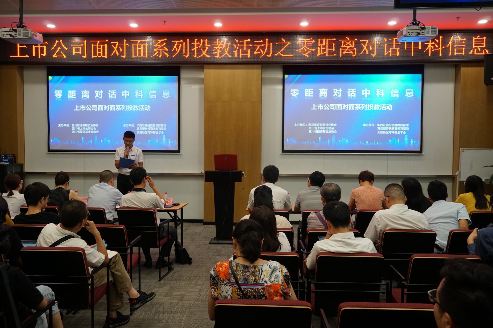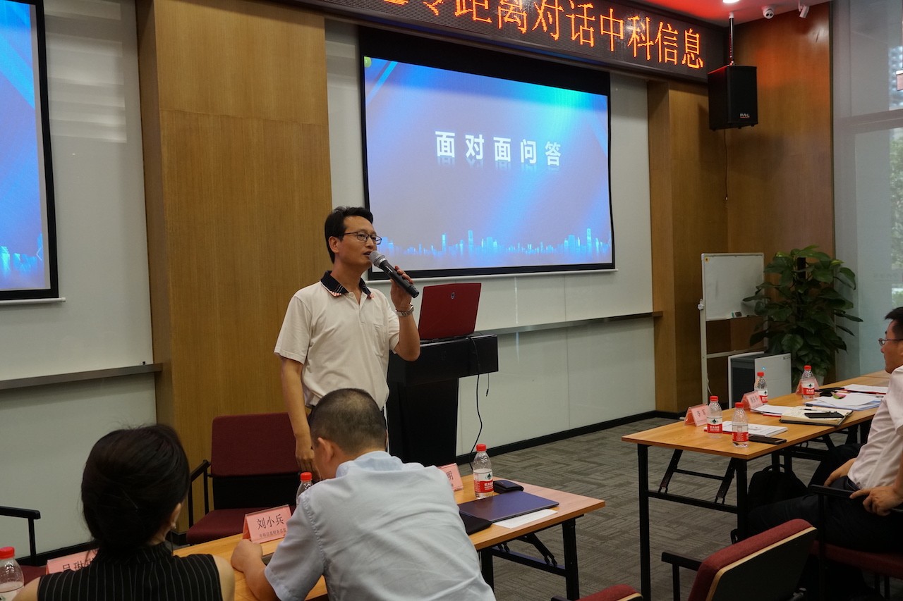 8月28日下午, 中科信息 (證券代碼:300678)參加了由四川省證券期貨業(yè)協(xié)會(huì)、四川省上市公司協(xié)會(huì)、四川投資基金業(yè)協(xié)會(huì)主辦的上市公司面對(duì)面系列投資者教育活動(dòng)。此次活動(dòng)主題為“零距離對(duì)話中科信息”,中科信息董事會(huì)秘書尹邦明、財(cái)務(wù)總監(jiān)劉小兵、四川省上市公司協(xié)會(huì)會(huì)員部副主任黃慶華及四川省內(nèi)部分機(jī)構(gòu)及個(gè)人投資者100余人參與了本次活動(dòng)。