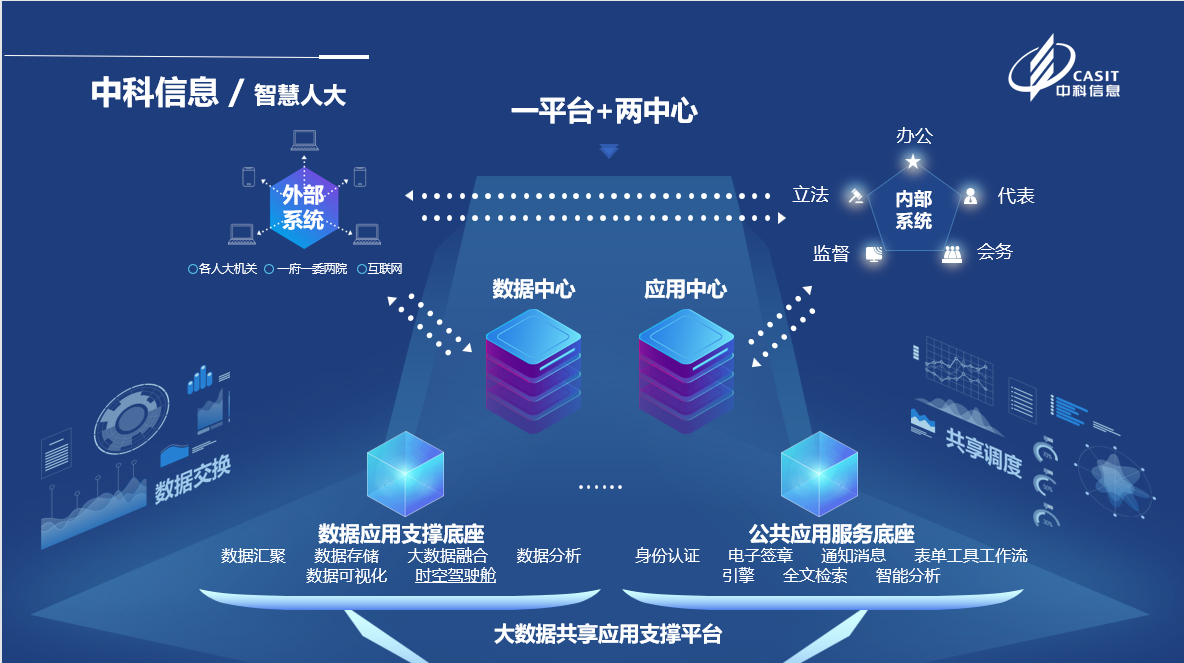 中科信息“智慧人大”是以自主創(chuàng)新、安全可靠為核心,以基礎(chǔ)設(shè)施為支撐,以標(biāo)準(zhǔn)為重點(diǎn),結(jié)合“互聯(lián)網(wǎng)+”、大數(shù)據(jù)、人工智能技術(shù)開發(fā)的智規(guī)范和管理機(jī)制為保障,以服務(wù)“三會”和人大代表為中心,以提高機(jī)關(guān)工作水平能業(yè)務(wù)平臺。